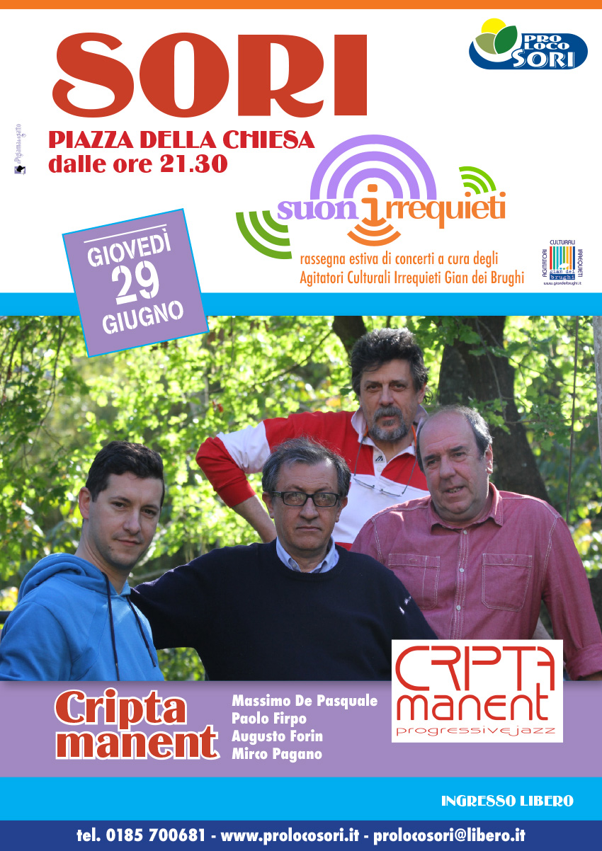 Il primo appuntamento vedrà protagonisti i “Cripta manent”, formatisi nel 1975, sciolti poi e riuniti ancora nel 2006 dopo una recensione trovata sul libro “Codice Zena” di Riccardo Storti che così li definiva: “Cripta, jazz-rock alla Perigeo, tecnica sopraffina, suonano spesso al 261 jazz club, nascono intorno al 1975, Augusto Forin al basso elettrico, Mirco Pagano, alla batteria, Massimo De Pasquale al piano elettrico, Mauro Carbone al sax”.